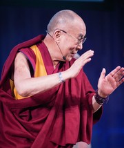 The Dalai Lama thanks the audience during Friday’s event sponsored by The Dalai Lama Center for Ethics and Transformative Values. His Holiness discussed the implications of global warming with a panel of professors from MIT and Harvard, followed by a conversation with middle and high school students in the SPARK program.