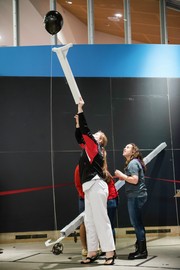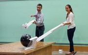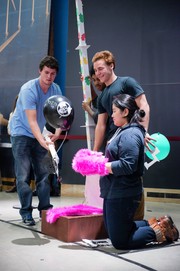 Thomas M. Burns ‘17, Emile M. Augustine ‘17, Kelly B. McGee ‘17, and June Kim ‘17 guide a balloon into their device shaped like the head of a beaver.