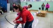 Zoe R. Sheinkopf ‘17, Zachary M. Mikaya ‘16, Diego A. Huyke ‘17 and Anna P. Zukowski ‘17 remove the remains of a balloon from their device, “The Viper.”