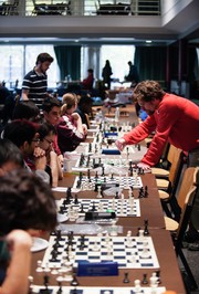 Chess Master Marc Esserman competes in 10 games simultaneously during Sunday’s MIT-Harvard Chess Tournament hosted by the MIT Chess Club.
