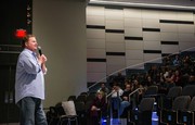 Comedian Michael Somerville performs in front of an audience at 10-250 on Saturday. The event, which featured teasing jabs at MIT as well as humorous remarks about his relationships with women, was hosted by the de Florez Fund for Humor and the Mechanical Engineering Naval Construction & Engineering Program.