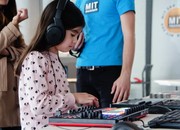 A young girl learns how to DJ at the sound technology exhibit at Girls Day on Saturday at the MIT Museum. The event featured nine hands-on exhibits geared toward young women interested in careers in science and engineering.