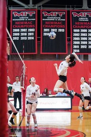 Meryl E. Gibbs ’16 leaps to spike the ball during Sunday’s NEWMAC championship game against second seed Babson College, which they lost by a slim margin during the last match. Regardless, the team, 27-5 for the season, received a bid for the NCAA tournament this past Monday.