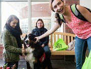 Students pet Beethoven the therapy dog at the MIT Wellness Fair on Friday in the Z-Center main lobby. The Wellness Fair provided students with a chance to relax and get information about de-stressing and support groups as well as get a massage, have a snack, and win raffle prizes.