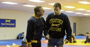 Steve Carell as John du Pont and Channing Tatum as Mark Schulz in Foxcatcher