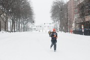 A jogger runs down the middle of Mass. Ave. during the snowstorm.