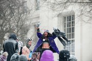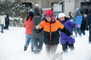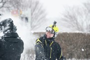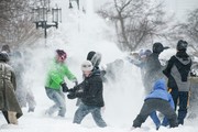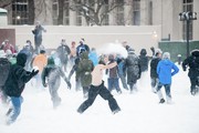 A student with a helmet-mounted GoPro camera targets his friend with a snowball in Killian Court.