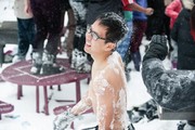 A shirtless student runs away from a snow-throwing friend in the midst of the fun.