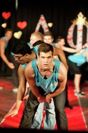 Nicholas H. Uhlenhuth ’16 leads contestants in a choreographed dance during Alpha Phi’s annual King of Hearts male beauty pageant. Proceeds went toward fighting heart disease and dysautonomia. Earlier this year, the sorority had lost a sister, Christina Tournant, who suffered from a form of dysautonomia.