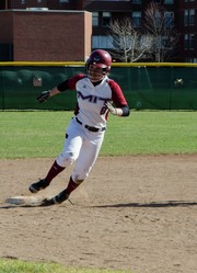 Kathryn K. Wopat ’15 rounds third base during MIT’s doubleheader against Wheaton College on Saturday. MIT lost both games 5-3.