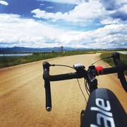The view from a bike as the team left Denver and approached the Rockies.