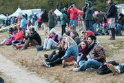 Spectators watch from Cambridge as rowers speed by during the Head of the Charles regatta.