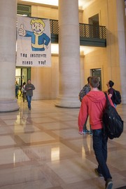 A banner hung in Lobby 7 on Tuesday to commemorate the release of the post-apocalyptic role-playing game Fallout 4. The game had been in the works since 2009.