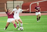 Amy A. Apostol ’19 battles a Springfield College player for control of the ball during last Saturday’s NEWMAC semifinal match. The Engineers lost to Springfield College in a penalty kick shootout 3-4.