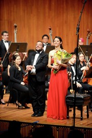 Director Adam Kerry Boyles and pianist Sarah E. Rumbley G stand for applause after performing Robert Schumann’s Piano Concerto in A minor, Opus 54, at the MIT Symphony Orchestra’s concert Saturday.