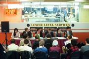 Candidates for President and Vice President of the Undergraduate Association debate in the Student Center lobby Tuesday night. From left: Sophia Liu ’17, Matthew Davis ’16, Laila Shehata ’16, Robert Mahari ’17, Siobhan Rigby ’16, and Daniel Wang ’16.