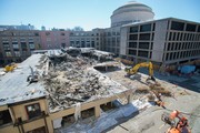 Building 12 as seen from Building 24 on Sunday, March 29. The building, about one quarter of the way through demolition, will make way for the new MIT.nano facility, which is expected to be complete by 2018.