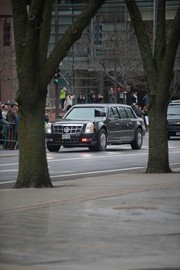 The Presidential Motorcade drives past the Whitehead Institute on Monday. President Barack Obama and First Lady Michelle Obama stopped at Area Four for lunch following the opening of the new Edward M. Kennedy Institute for the United States Senate in Boston.
