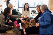 Students gather around therapy dogs during Wednesday’s Community Reflection. The reflection also included gentle music and an art project consisting of hundreds of paper stars “to represent the strength of our community.”