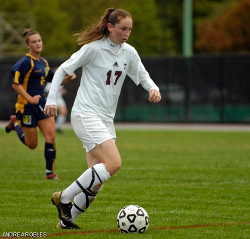 Amy S. Ludlum ’08 dribbles in space in the women’s soccer game against the University of Massachusetts Dartmouth Tuesday. The Engineers triumphed over the Corsairs 6-1, despite the heavy rain.