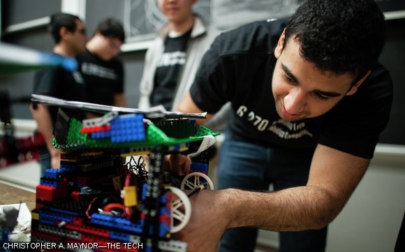A student fixes a part on his team’s robot.