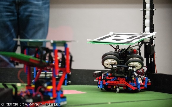 Two robots compete on the playing field. Robots could score points by performing various activities on the field.