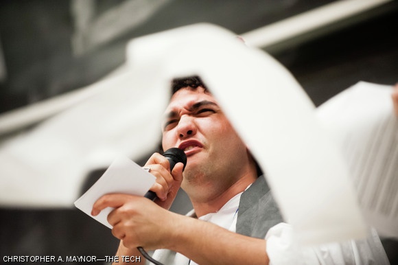 Jamal A. Elkhader ’13 performs at the nth Annual Concert in Bad Taste in front of a rowdy audience in 26-100 on Saturday evening as streams of toilet paper thrown by crowd members fly by.