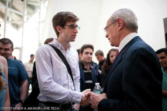 Rafael Reif shakes hands with Paul M. Kominers ’12 at a student-sponsored reception for the president-elect.