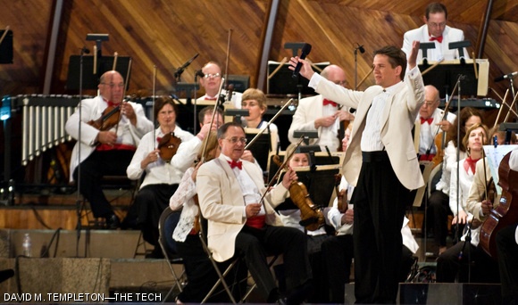 Boston Pops conductor Keith Lockhart gestures to the crowd during the Pop’s public rehearsal on July 3 at the Hatchshell on the Esplanade.