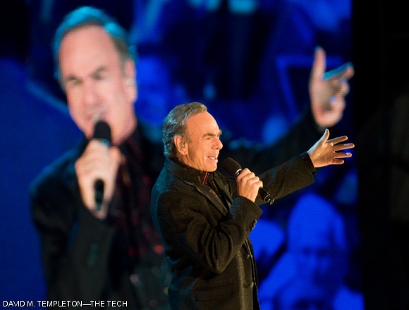 Singer Neil Diamond sings his signature song “Sweet Caroline” to large crowd packed on the Esplanade during the rehearsal of CBS’s national broadcast of the Boston Pops Fireworks Spectacular on July 3.