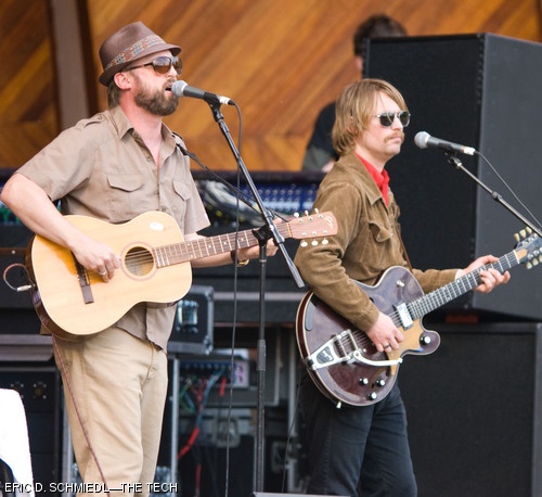 Josh McCrea (left, vocalist) and Xan McCurdy (right, guitarist) of alternative rock band Cake perform at Earthfest 2008 on May 24 at the Hatch Shell in Boston.