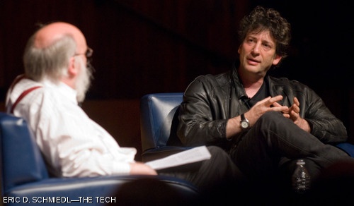 Author Neil Gaiman participates in a question-and-answer discussion between him and Professor Henry Jenkins III, MIT Comparative Media Studies program head. Gaiman gave the first annual Julius Schwartz Lecture at Kresge Auditorium on May 23.