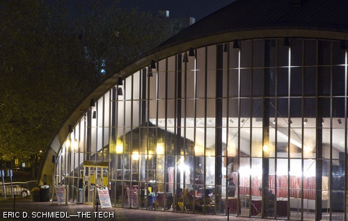 Kresge Auditorium’s lobby, a polling place, glows with the bright lights over the voting booths at the very end of Election Day 2008.