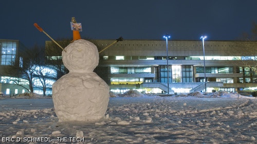 A snowman is seen in Kresge Oval on Tuesday evening.