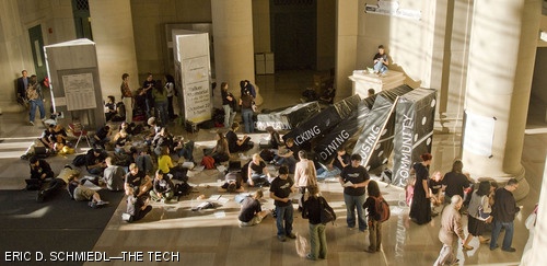 Students from the Burton 5, Conner 2, and Burton 4 halls in Burton-Conner House set up a “moonbounce” inflatable structure in Lobby 7 just after midnight on Tuesday morning.