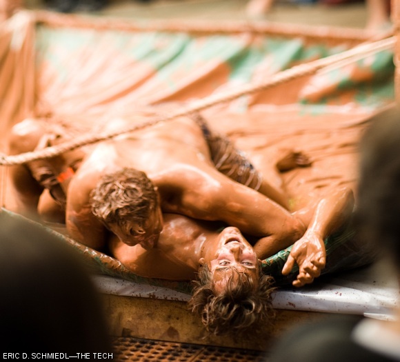 Erik D. Fogg G mud-wrestles Terral R. Jordan ’07 after the ignition of the roast pit during Senior House’s annual Steer Roast party on May 1.