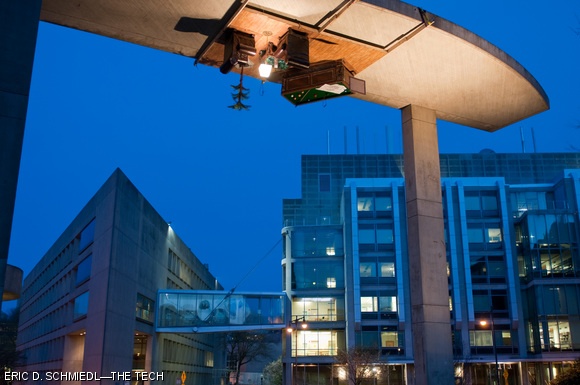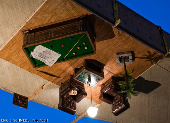 For Campus Preview Weekend 2010, hackers installed a high-class lounge (complete with pool table, sleeping cat, whiskey, and hack plans) upside down on the Media Lab Arch on Thursday morning.