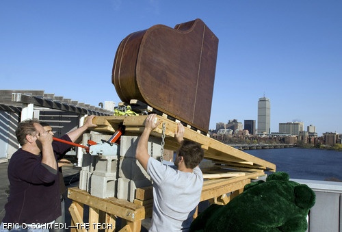Baker residents prepare to send a grand piano to a smashing demise six stories below in the annual Baker House Piano Drop on Drop Date yesterday.