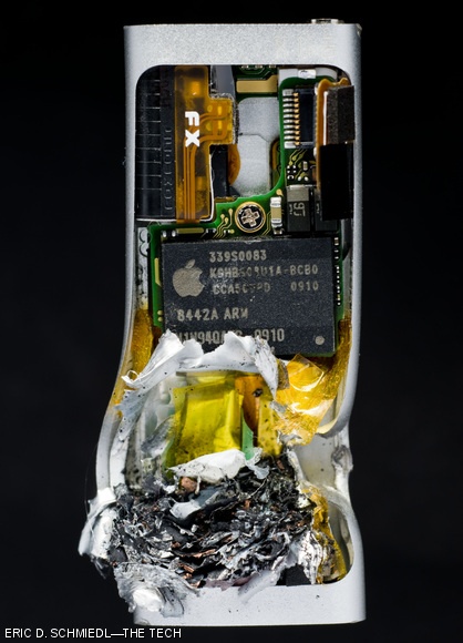 The busted iPod Shuffle is seen after its encounter with a .22 bullet. The ash seen in the lower part of the unit where the bullet struck is the Lithium battery.