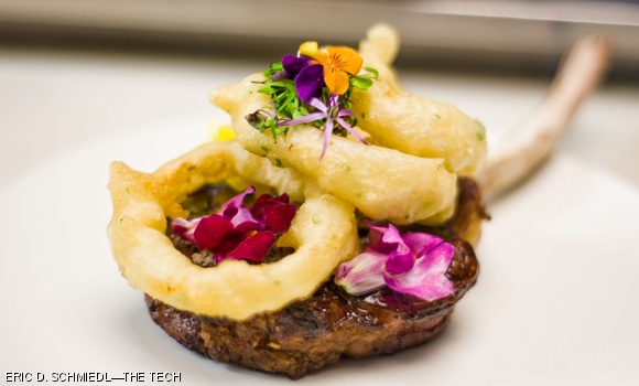 A 26 oz. T-bone steak with allium butter and fried onions is served in KO Prime style, decorated with flower petals.