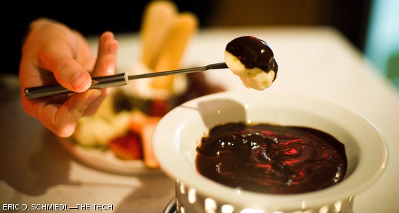 A dark chocolate fondue with a splash of Grand Marnier with fresh fruits and cookies for dipping.