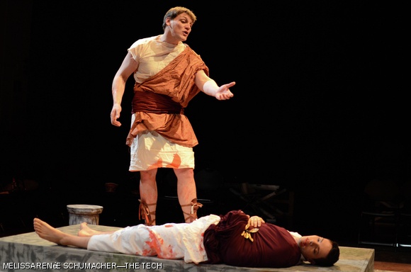 Mark Antony (Zachary D. Tribbett ’13) stands over the dead body of Julius Caesar (Christopher D. Smith ’13) in the MIT Shakespeare Ensemble’s performance of “Julius Caesar.”