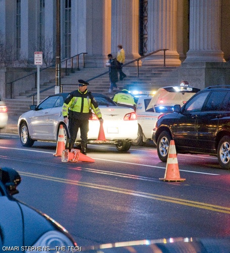 The stoplights and streetlights have periodically been out at the 77 Massachusetts Ave. crosswalk during recent evenings. Shown is an officer directing traffic in lieu of the traffic signal.