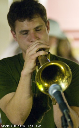 Matthew M. Stevenson G plays the trumpet during a performance by Don Byron’s Sugarhill Ensemble this past Sunday, April 20 in the Senior House basement.