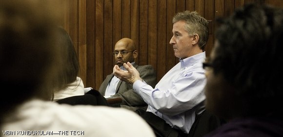 Michael Owu (left) and Steve Marsh (right), directors in the MIT Investment Management Company, discuss the Kendall Square Development Initiative at a UA Senate meeting on Monday.